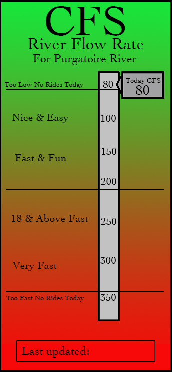 Update for July 13th, The water is runing at around 60> cfs. We are closed for the summer, sorry see you in 2025.